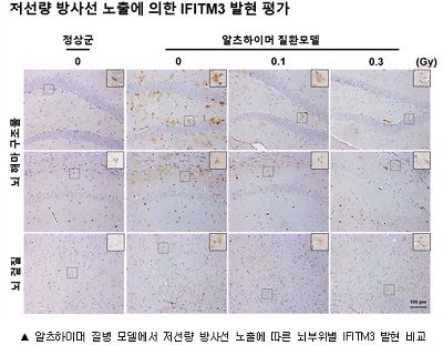특히 알츠하이머병의 원인인자로 알려진 신경세포 파괴 독소 단백질인 베타아밀로이드 생성에 관여하는 조절인자(IFITM3)가 저선량 방사선을 쪼이지 않은 실험쥐에 비해 50% 가량 감소되는 것을 확인했다.