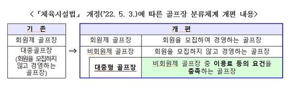 문체부는 코로나19 이후 골프장의 수요·공급 불균형으로 인한 불안정한 이용가격의 문제를 해결하기 위해 기존의 회원제·대중골프장 이분 체계를 회원제·비회원제·대중형 골프장 삼분 체계로 개편한 바 있다.