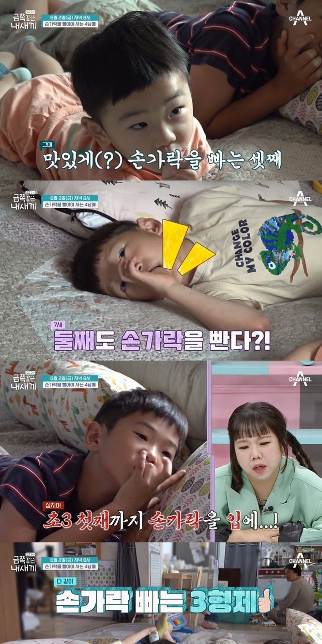 이날 금쪽이네 4남매는 거실에 모여 TV를 시청했다. 그때 3세 셋째 아들이 손가락을 빨기 시작했고, 7세인 둘째 아들과 초등학교 3학년인 첫째 아들까지 줄줄이 손가락을 빨아 눈길을 끌었다.
