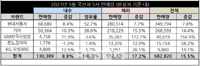 1일 완성차업계에 따르면 현대차·기아, 한국지엠, 르노코리아, KG모빌리티는 5월 한달 간 총 68만2820대를 내수와 글로벌 시장에서 판매한 것으로 집계됐다. 이는 지난해 같은 기간보다 11.5% 증가한 수준이다.