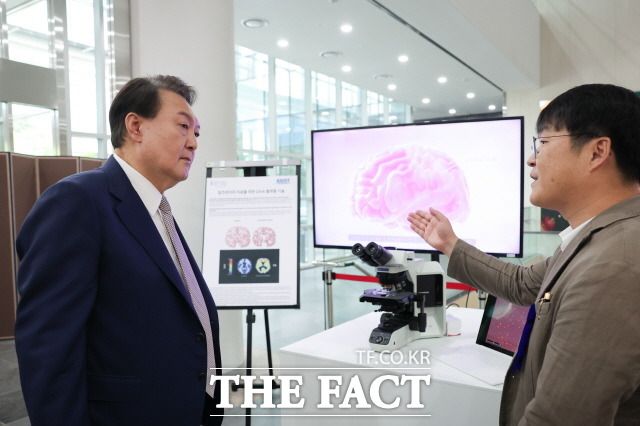 정부는 해외 연구기관과의 공동연구와 디지털 데이터 개방 등을 통해 바이오 클러스터를 육성해나간다는 계획이다. 1일 서울 강서구 서울창업허브 엠플러스에서 열린 제5차 수출전략회의에 앞서 김찬혁 KAIST 교수에게 알츠하이머 단백질 치료제에 대한 설명을 듣고 있는 윤 대통령. /대통령실 제공