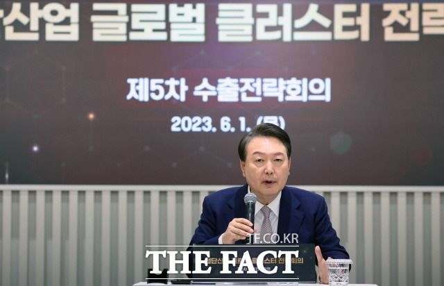 윤석열 대통령이 1일 서울 강서구 서울창업허브 엠플러스에서 열린 제5차 수출전략회의를 주재하고 첨단산업 경쟁력 강화를 강조했다. /뉴시스