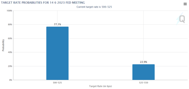 6월 7일(현지시간) 시카고상품거래소(CME) 그룹의 페드워치에 따르면 이날 오전 7시 15분 현재 시점 미 연방준비제도(Fed·연준)가 오는 6월 14일 예정된 연방공개시장위원회(FOMC) 회의에서 금리를 0.25%포인트 인상할 가능성은 77.1%에 달했다. 반면 기준금리를 동결할 가능성은 21.8%에 그쳤다. 다음 주로 다가온 연준의 통화정책회의를 앞두고 금리를 추가로 올릴 필요가 있다는 의견과 이달에는 금리 인상을 쉬어가자는 주장이 혼재된 상황이다. 골드만삭스는 연준이 7월에 기준금리를 0.25%포인트 인상할 가능성이 가장 크다고 밝혔다.