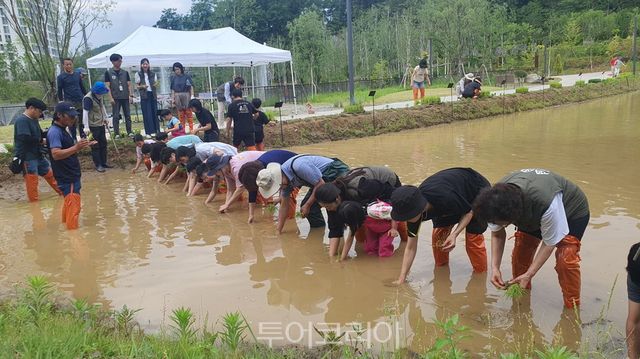 수원시는 오늘(8일) 영흥수목원 논 전시원에서 토종벼를 심는 ‘한반도 16도 토종벼 논 정원’ 모내기 행사를 진행했다.