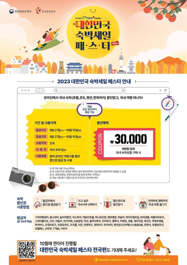[투어코리아=유경훈 기자] 문화체육관광부(이하 문체부)와 한국관광공사(이하 공사)는 ‘추석 연휴와 함께하는 대한민국 숙박세일 페스타’를 진행한다.