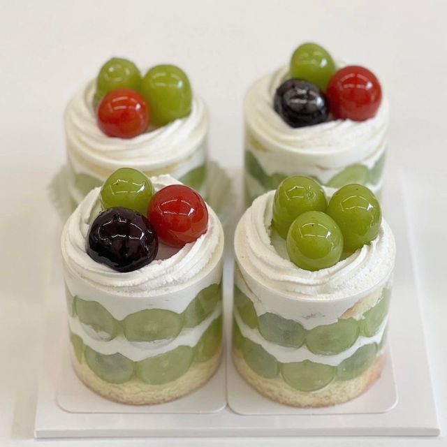 부드러운 생크림 케이크 속으로 과일 필링이 듬뿍 들어간 케키하우스의 케이크. 상단은 샤인 머스캣과 블루베리 탕후루가 올라가 있어요. 사르르 녹는 크림과 파삭한 탕후루의 조화가 돋보이는 케이크에요.
