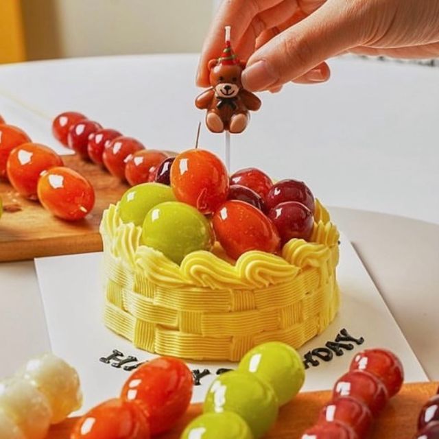 청주대학교 근처의 케이크 샵 케익후에서 판매하는 미니 탕후루 케이크. 바구니 모양의 노란 크림 베이스에 위로 샤인머스캣, 포도 등의 탕후루가 귀염뽀짝해요. 탕후루를 좋아하는 친구 생일 케이크로 좋을듯합니다.