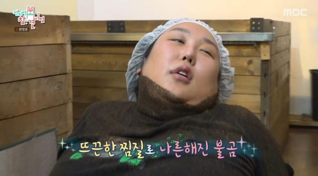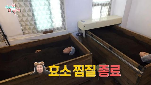 힘겹게 운동을 마친 두 사람은 독소를 빼기 위해 효소 찜질에 도전했다. 효소 찜질은 쌀눈, 쌀겨, 약재 등을 발효해 만든 효소 속에 누워 체온을 높이고 혈액 순환을 원활히 해 몸 속 독소를 빼내는 것으로 디톡스에 효과적인 미용방법이다. 노폐물과 독소가 배출된 덕분에 피부가 맑아지고 근육통이나 관절염 등의 증세가 완화되는 효과도 볼 수 있다고. 찜질 시간은 15~30분 정도인데, 비록 누워있지만 2시간 동안 달리는 것과 같은 에너지가 소비되기 때문에 너무 오래 하면 몸에 무리가 갈 수 있다. 효소 찜질 후에는 충분한 휴식을 취하는 것이 필요한 이유다. 풍자는 65도로 생각보다 뜨거운 효소의 온도에 놀랐지만 파묻힌(?) 후에는 편안히 수면을 취했다. 물론 시커먼 효소를 묻히고 일어서는 모습은 불곰을 연상하게 했지만 씻고난 후에는 붓기와 살이 빠져있어 효소 찜질의 효과를 가늠할 수 있었다.