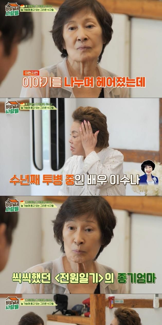 이날 김혜자와 '회장님네' 가족들은 '전원일기'에서 함께 했던 배우들의 소식을 나누며 대화를 했다. 김수미는 김혜자에게 '종기엄마' 이수나를 언급하며 "소식아냐, 뇌사 상태로 벌써 몇년 됐다"라고 했다. 김혜자는 "이수나씨? 그 분 참 씩씩한 여자였다"라고 했다.