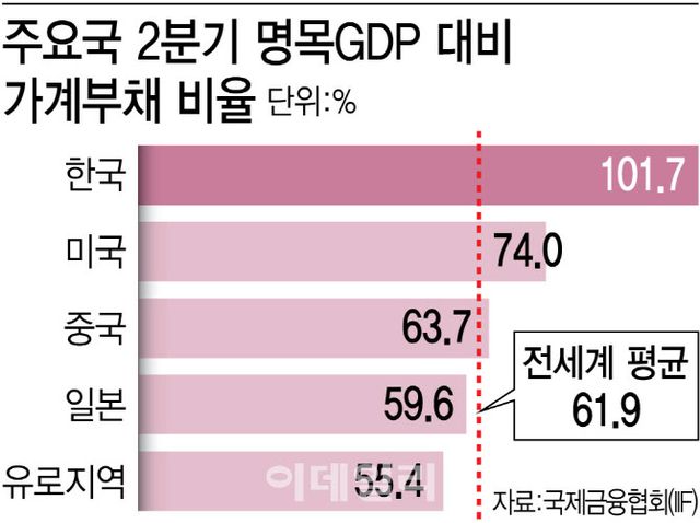 국제결제은행(BIS)에서 집계한 1분기 가계부채 비율에서도 우리나라는 스위스(128.0%), 호주(110.6%), 캐나다(101.9%) 다음으로 가장 높았다. BIS의 1분기 가계부채 비율은 101.5%로 IIF가 집계한 1분기 가계부채 비율 102.2%와 차이가 벌어진다. 명목 GDP와 가계부채를 어떻게 산정하느냐에 따라 기관별로 통계가 달라질 뿐 추세적인 흐름은 비슷하다.