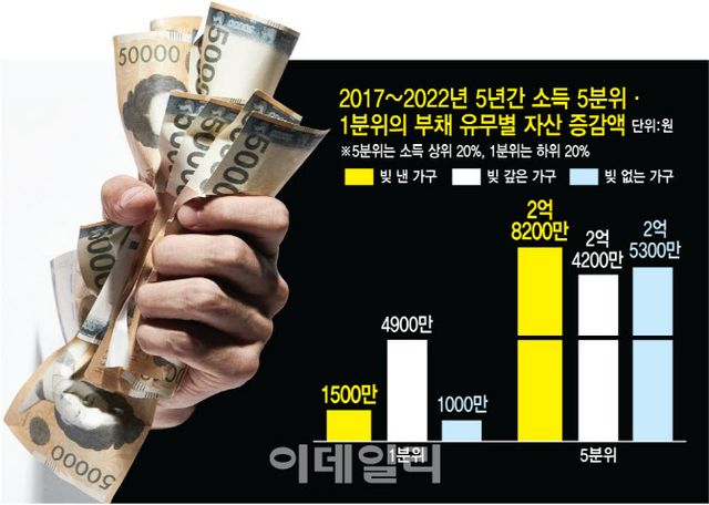 그런데도 왜 고소득자는 빚을 갚지 않을까. 빚이 여전히 자산 증식의 주요 수단이 되고 있기 때문이다. ‘빚의 마법’이 고소득자에게만 통했다는 점에 주목할 필요가 있다. 한은에 따르면 2017~2022년 소득 5분위 가구는 신규로 빚을 낼 경우 순자산이 2억8000만원 늘어났고 빚이 없거나 빚을 상환한 경우엔 각각 순자산이 2억5000만원, 2억4000만원 늘어나는 데 그쳤다. 빚이 자산 증식의 ‘레버리지’ 역할을 제대로 한 것이다. 반면 1~4분위 가구는 빚이 없는 경우 자산이 더 늘어났다. 빚을 낸 1분위(월평균 소득 100만원)는 순자산이 1500만원 증가했는데 빚을 갚은 경우 4900만원 증가했다.