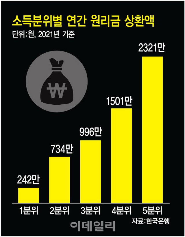 고소득자는 빚이 늘어나고 대출금리가 오르면서 이자 부담이 급증했다. 월 이자비용만 따져도 코로나19 이전인 2019년 4분기 17만원에서 올 2분기 26만원으로 무려 53%가 급증했다. 다른 소득계층이 30% 안팎 증가한 것에 비해 더 크게 늘어난 것이다. 소득 5분위의 원리금상환액은 가구당 2020~2021년 연간 2300만~2600만원이었다. 월로 따지면 200만원 안팎의 돈이 빚 상환에 쓰인 것이다. 소득 5분위의 처분가능소득이 월 710만원(2분기)이라는 점을 감안하면 대략 소득의 3분의 1이 빚 갚는 데 사용됐다. 금리 인상이 본격화된 작년에는 빚 부담이 더 커졌을 것으로 보인다.
