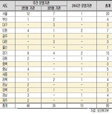 특히 대구, 광주, 대전, 울산, 세종, 충북, 경남, 경북, 제주 등의 경우 24시간 운영기관이 없다.