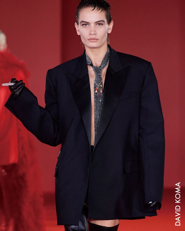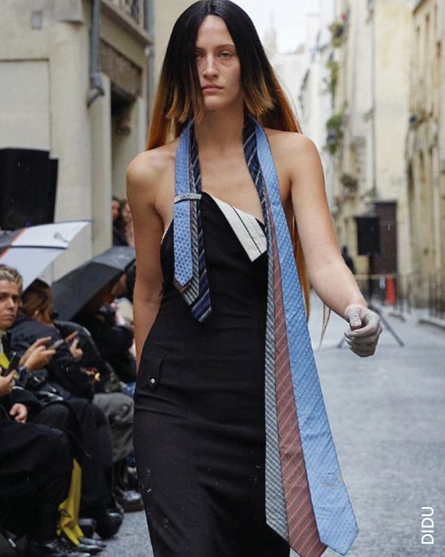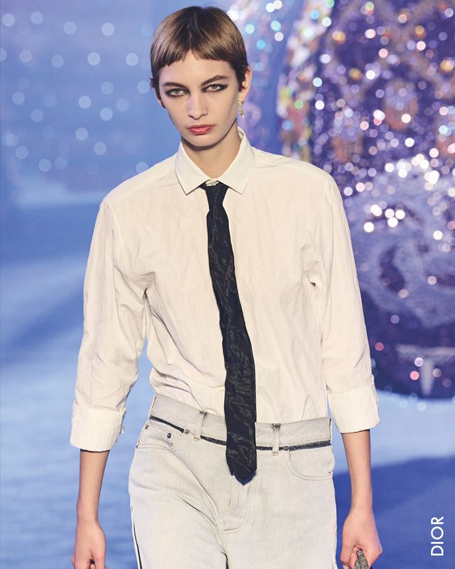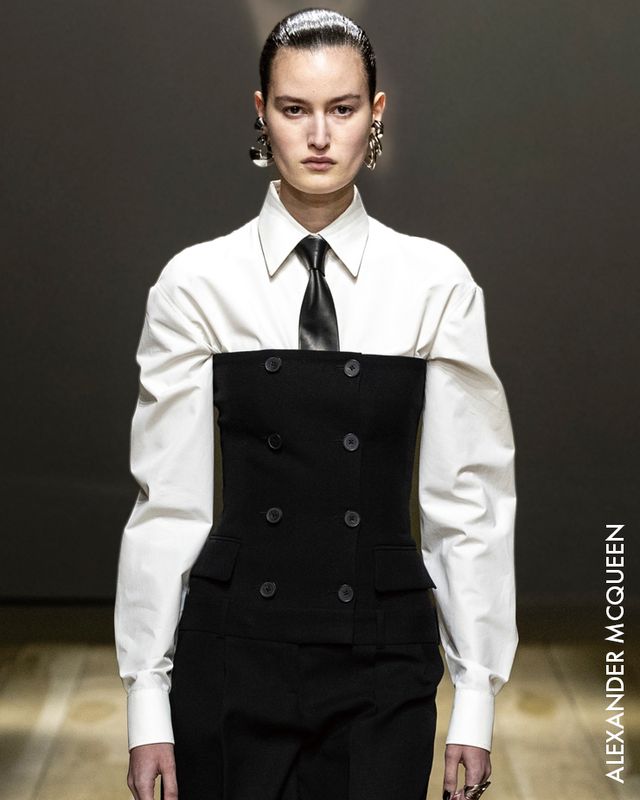 딸의 접근방식처럼 넥타이를 다른 시선으로 바라본 건 피치올리만이 아니었다. 이번 시즌 강세인 80년대 파워 수트 룩이 이어졌던 알렉산더 맥퀸 쇼에선 실루엣만으로 구분이 어려울 정도로 젠더리스한 모습이었는데, 특히 셔츠에 넥타이를 하고 뷔스티에를 매치한 남녀 룩이 인상적이었다.