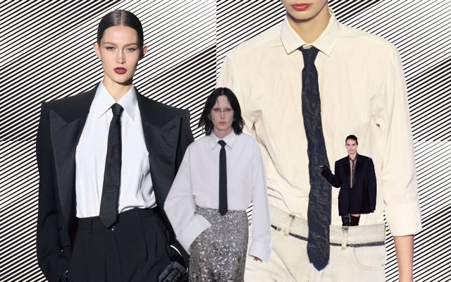 지난 생 로랑 남성 컬렉션에서 얼굴을 절반 이상 가린 니트 드레스와 카울 장식의 실키 룩을 선보이며 남성과 여성 컬렉션의 간극을 좁혀나가고 싶다고 밝힌 안토니 바카렐로의 인터뷰가 생각났다. 하지만 올 초부터 남자들의 스커트를 입는 트렌드와 넥타이를 활용하는 방식을 단지 ‘젠더리스’ 흐름으로만 묶기에는 실제 활용 범위와 카테고리에 한계가 있다. 끊임없이 변주되고 있는 2000년대 트렌드는 그런지 펑크를 재해석하며 셔츠를 일부러 헝클어뜨리고 타이를 느슨하게 매어 연출했고, 단정한 오피스 룩을 완벽하지 않은 모습으로 비튼 ‘오피스 코어’에도 타이는 전체 룩의 완성도를 좌우하는 한 수의 아이템으로 등장했다. 마구 구겨진 셔츠와 속옷이 보일 정도로 내려간 로라이즈 펜슬 스커트 등 주얼리를 절제해야 하는 룩에 좁고 가느다란 타이는 가장 볼드한 액세서리로 존재감을 발휘했으니까.