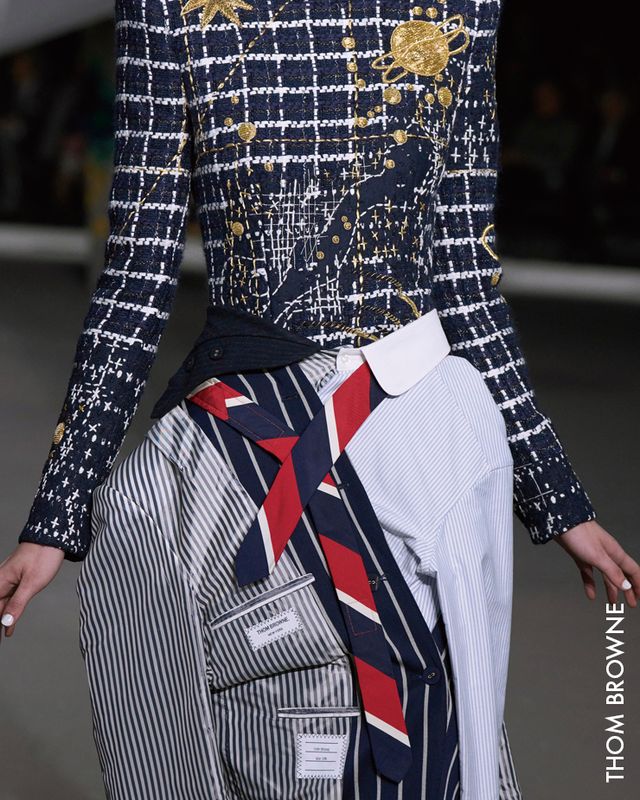 그뿐 아니다. 체크와 니트 스웨터, 플리츠스커트의 조합으로 완성되는 프레피 룩에도 타이는 빼놓을 수 없는 아이템이다. 브랜드 초창기부터 끊임없이 프레피 룩을 재해석해 온 톰 브라운은 넥타이를 해체하고 재구성하기를 반복하며 목에서 벗어나 룩을 완성하는 하나의 디테일로 활용하기에 이르렀다. 이제는 ‘넥타이’ 하면 중성적 스타일로 반향을 일으킨 1977년 영화 〈애니홀〉의 다이앤 키튼으로 통용되던 시절도 지났다. 벨라 하디드처럼 허리 라인이 강조된 베스트 룩에도 타이를 더할 수 있고, 엠마 코린처럼 볼 캡을 쓰고 넥타이를 더한 수트 차림으로 테니스 경기를 관람할 수도 있다.
