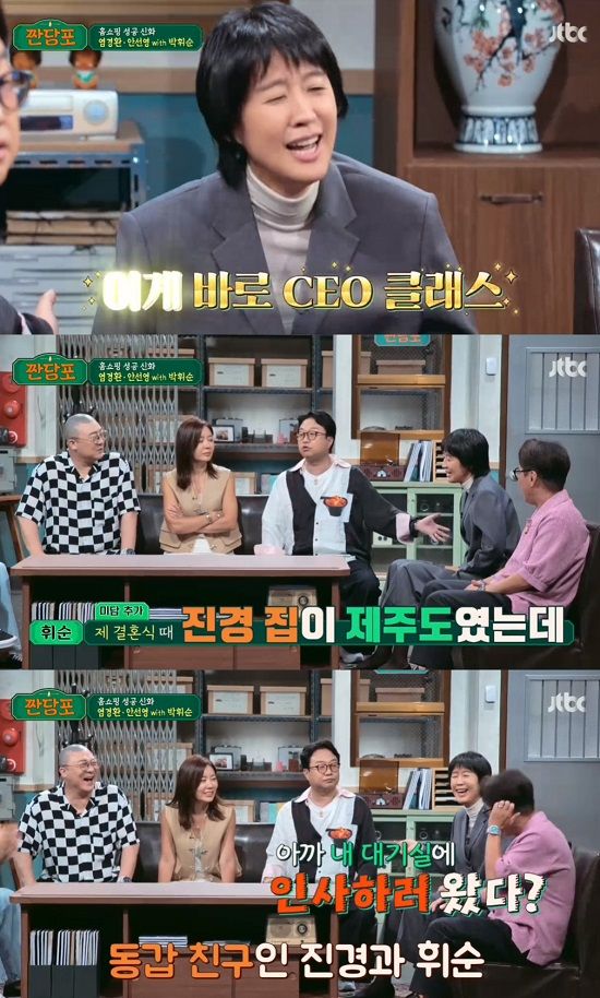 박휘순은 "홍진경 집이 제주도인데 제가 결혼식을 코로나 한창 때 했다. 그런데 홍진경이 (서울 결혼식으로) 와서 부모님 옆에서 인사드리고 손님들과 인사했다. 기억한다"며 미담을 덧붙였다.