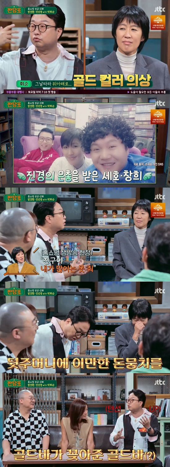 19일 방송한 JTBC 예능 프로그램 '짠당포'에는 홈쇼핑 성공 신화 특집으로 개그맨이자 쇼호스트 염경환, 안선영, 박휘순이 출연했다.