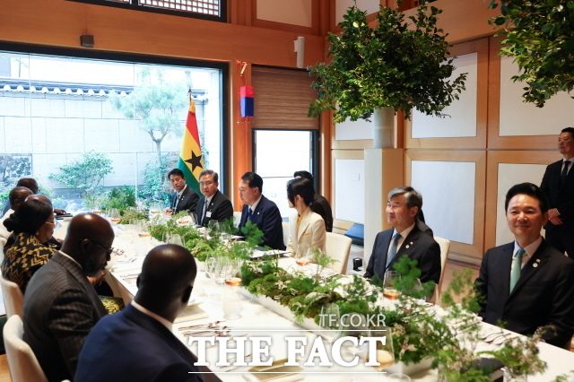 윤 대통령은 오찬 자리에서 2030 세계박람회 부산 유치 지지를 호소하는 한편, 양국 관계 발전 방안을 논의했다고 대통령실은 전했다. 나나 아쿠포아도 가나 대통령 부부와 오찬 중인 윤 대통령 부부. /뉴시스
