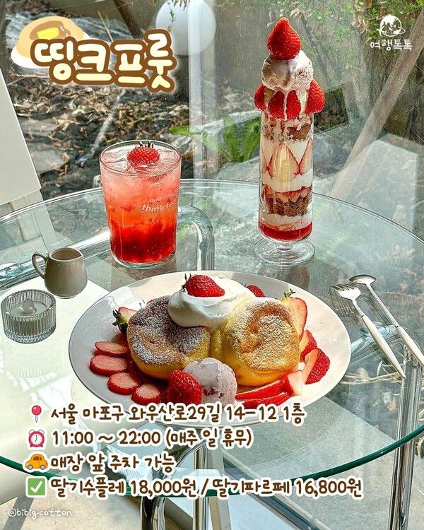 홍대 띵크푸룻은 과일 소믈리에가 지금 시즌에 가장 향긋하고 달콤한 과일들을 시즌별로 컨택바잉하는 과일에 진심인 카페입니다. 띵크프룻은 파르페에 사용되는 아이스크림은 하겐다즈만 사용하며 모든 디저트는 동물복지 유기농 유정란만 사용합니다.