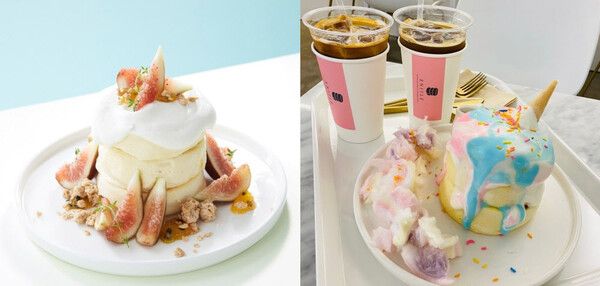 이곳의 시그니처 메뉴는 바로 유니콘 수플레팬케이크입니다. 동화나라를 연상하게 하는 비주얼을 자랑하는 3단으로 쌓은 팬케이크와 솜사탕, 메이플 시럽이 함께 제공됩니다. 알록달록한 파스텔색상이 인스타감성을 자극해 먹기 아까울 정도인데요.
