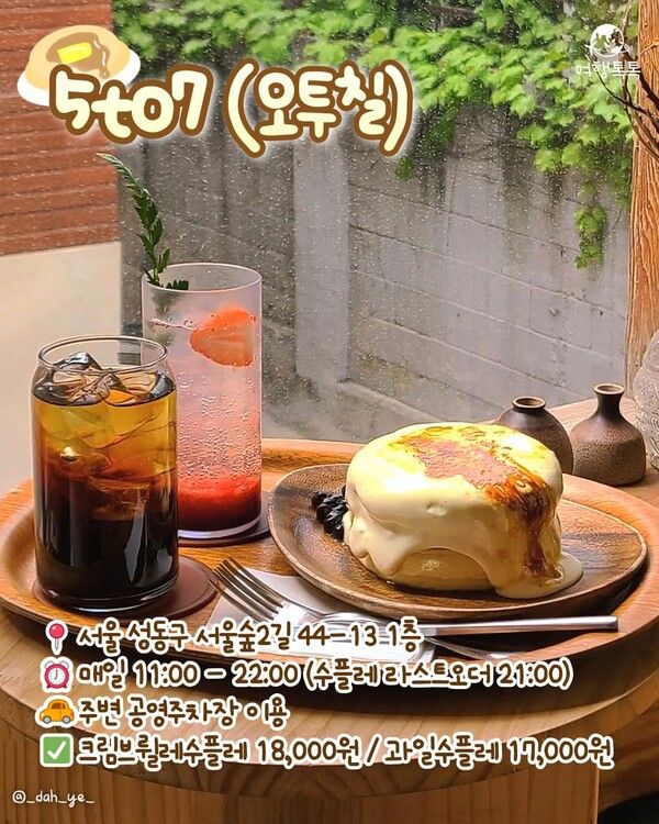 서울숲 5to7의 시그니처인 수플레는 총 5가지 종류(과일, 얼그레이, 크림 브륄레, 말차, 티라미수)가 있으며, 파블로바는 당일 한정수량으로 판매합니다. 오투칠은 수플레 팬케이크 맛집으로 유명하지만 핸드드립커피부터 크렘브륄레 아인슈페너, 수제로 만든 패션후르츠 과일청 등 음료들도 하나같이 신경 쓴 티가 나는데요.
