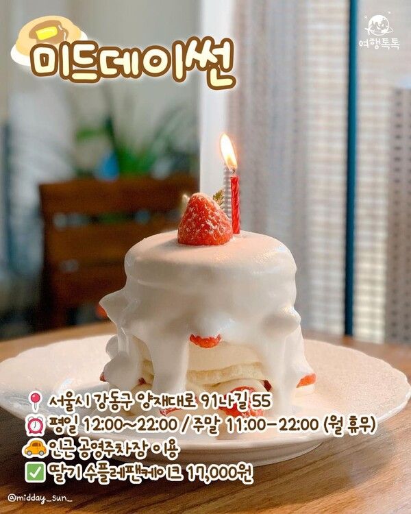 상큼하고 예쁜 비주얼의 딸기수플레는 물론 당충전을 제대로 할 수 있는 누텔라수플레와 티라미수 수플레도 함께 추천합니다. 미드데이썬은 둔촌동역 3번 출구에서 가까우며 올림픽공원 북 2 문쪽에서 가깝게 올 수 있는 위치입니다. 주차장은 따로 없어 대중교통 이용을 추천합니다.