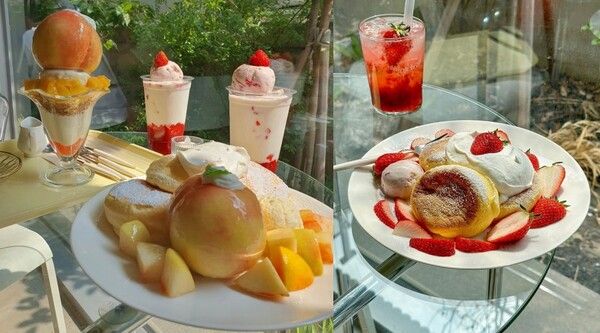 또한 이곳의 시즌한정 베스트 메뉴인 복숭아 수플레는 팬케이크 사이에 복숭아 콩포트가 들어가 있는데요. 생복숭아를 직접 졸여만든 복숭아콤포트와 부드러운 크림이 수플레와 완벽한 조합을 자랑합니다. 팬케이크 위 생복숭아 데코와 생크림에도 복숭이 향이 가득해 먹는 내내 복숭아를 즐길 수 있는 복숭아수플레팬케이크입니다.
