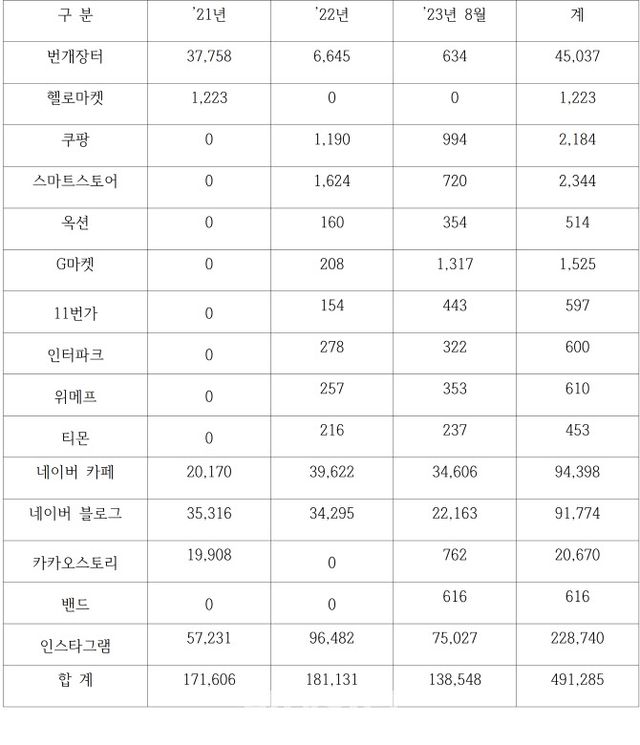 정청래 더불어민주당 의원이 특허청 한국지식재산보호원으로부터 받아 분석한 자료에 따르면 최근 3년간(2021년 ~ 2023년 8월) 온라인 마켓 위조상품 유통 적발이 49만1285건에 달하는 것으로 나타났다.