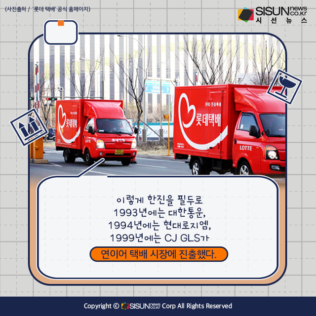 이렇게 한진을 필두로 1993년에는 대한통운, 1994년에는 현대로지엠, 1999년에는 CJ GLS가 연이어 택배 시장에 진출했다.