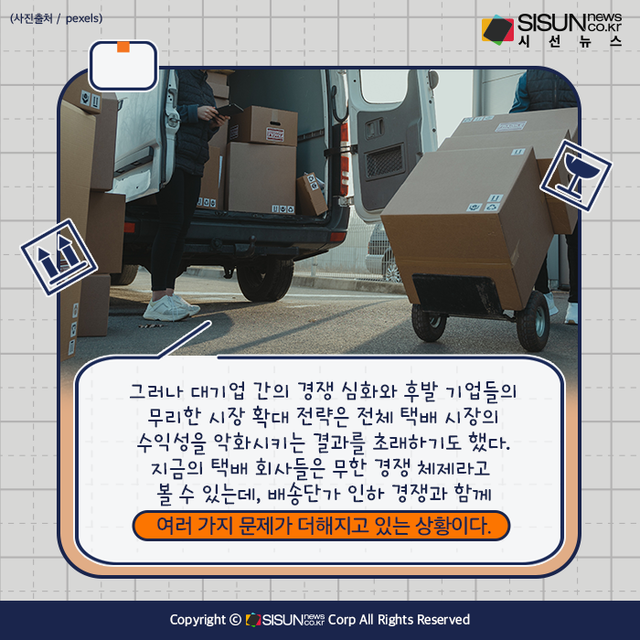 그러나 대기업 간의 경쟁 심화와 후발 기업들의 무리한 시장 확대 전략은 전체 택배 시장의 수익성을 악화시키는 결과를 초래하기도 했다. 지금의 택배 회사들은 무한 경쟁 체제라고 볼 수 있는데, 배송단가 인하 경쟁과 함께 여러 가지 문제가 더해지고 있는 상황이다. 판매사인 유통회사로부터 택배회사가 받는 수수료가 낮아지면서 그것을 택배기사가 감당하게 되고 택배기사의 수입이 줄어드는 형태로 나타나게 된 것. 이후 계속해서 택배기사들의 과로사 문제로 인한 사회적 관심이 이어지고 있으며 기사들은 노동 환경에 대한 적극적인 개선을 요구하고 있다.