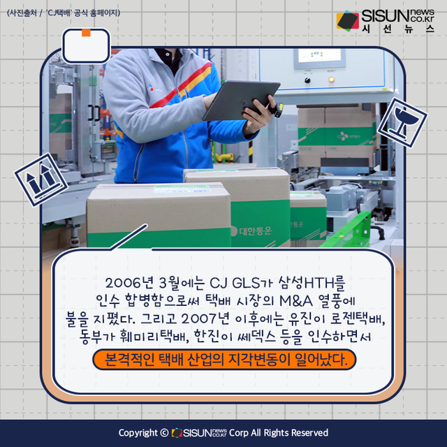 2006년 3월에는 CJ GLS가 삼성HTH를 인수 합병함으로써 택배 시장의 M&A 열풍에 불을 지폈다. 그리고 2007년 이후에는 유진이 로젠택배, 동부가 훼미리택배, 한진이 쎄덱스 등을 인수하면서 본격적인 택배 산업의 지각변동이 일어났다.