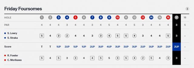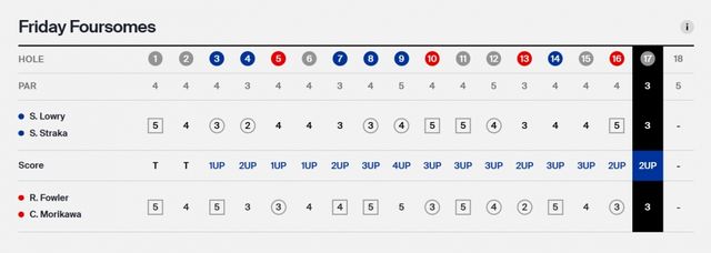 로리 매킬로이(북아일랜드)는 토미 플리트우드(잉글랜드)가 호흡을 맞춰 잰더 쇼플리-패트릭 캔틀레이를 1홀차로 힘겹게 눌렀다. 매킬로이-플리트우드는 13번홀까지 2홀차로 내내 앞서가다가 14번홀에서 홀을 내줬지만 15번홀(파4)에서 다시 찾았다. 하지만 16번홀(파4)에서 매킬로이와 플리트우드가 위기를 맞았다. 플리트우드가 티샷한 볼이 그린앞 해저드 근처 러프의 흙속에 볼이 박혔다. 매킬로이가 극적으로 볼을 그린에 올렸지만 핀과 멀어 파로 마무리. 하지만 캔틀레이가 버디를 잡아내며 1홀을 내줬다. 1홀차였다. 하지만 승부는 17번홀(파3)에서 갈렸. 매킬로이가 핀 1m이내에 붙인 볼을 플리트우드가 버디를 잡아내며 1홀 남기고 2홀차로 기쁨을 누렸다.