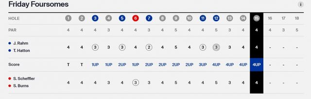 볼 1개를 번갈아 치는 포섬으로 열린 1라운드에서 매치 1인 존 람(스페인)과 티럴 해턴(잉글랜드)가 호흡을 맞춰 스코티 셰플러와 샘 번스를 3홀 남기고 4홀차로 완승했다. 2홀차로 앞서가던 람과 해턴은 11번홀(파4) 버디에 이어 12번홀(파5)에서 이글을 잡아내며 4홀차로 벌리며 우승을 확정했다.