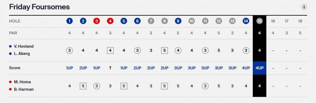 이어 매치2에서는 빅토르 호블란(노르웨이)와 루트비히 아베리(스웨덴)가 맥스 호마-브라이언 하먼을 역시 3홀 남기고 4홀차로 꺾었다. 연습라운드 파4홀에서 홀인원을 기록했던 호블란은 아베리와 짝을 이뤄 11번홀에서 버디를 잡아 3홀차로 도망가더니 15번홀(파4)에서 버디를 골라내 쐐기를 박았다.