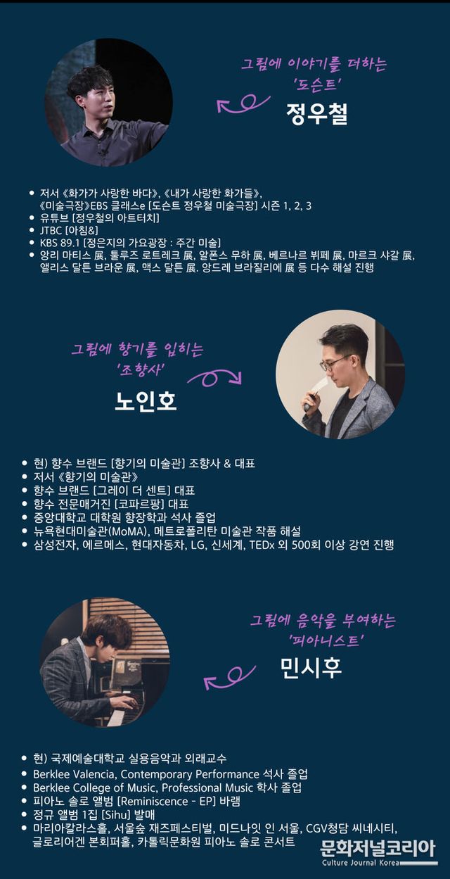 미술관과 TV를 종횡무진하고 있는 스타 도슨트 정우철이 마이크를 잡는다. 향수 브랜드 '향기의 미술관' 조향사이자 대표인 조인호는 두 화가의 작품을 자신만의 관점으로 해석해 조향한 향을 시향지로 나눈다. 피아니스트 민시후는 두 화가에게 영감을 받아 작곡·편곡한 음악을 들려줄 예정이다.