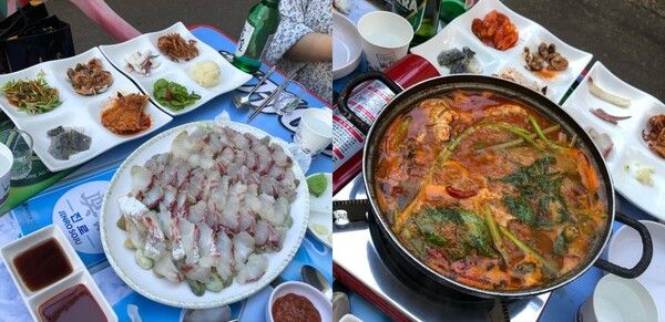 청계어시장 회는 숙성회로 쫀득한 식감이 일품입니다. 회가 나온 이후에도 코스요리처럼 계속해서 음식이 나오는데요. 전이나 탕 등 다양한 안주를 부족하지 않게 먹을 수 있습니다. 건물이 다소 오래되다 보니 식당 내부나 수조, 기본 접시와 위생이 깔끔한 편은 아닙니다.