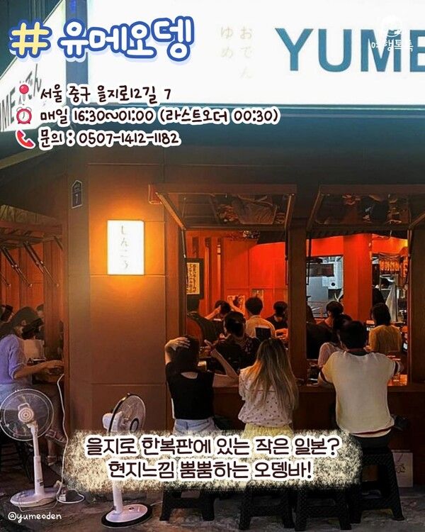 을지로 한복판에 작은 일본이 있는 듯한 현지느낌이 물씬 나는 오뎅바를 소개합니다. 유메오뎅 을지로점은 을지로3가역 11번출구에서 도보 3분거리에 위치해있는데요. 연남이 본점이고 을지로는 최근에 오픈한 신상 야장 맛집입니다.