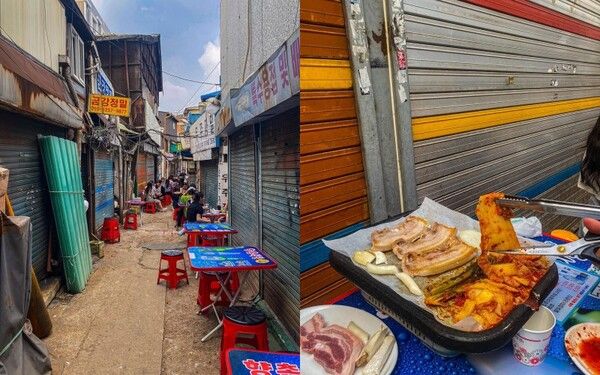 향촌식당은 선선한 날씨와 함께 핫한 을지로 노상 삼겹살 맛집인데요. 상가 사이에 테이블을 깔아놓고 밖에서 구워 먹는 삼겹살입니다. 저녁 5시도 안 된 시간에도 자리가 만석일 정도로 인기 있는 을지로 맛집입니다.