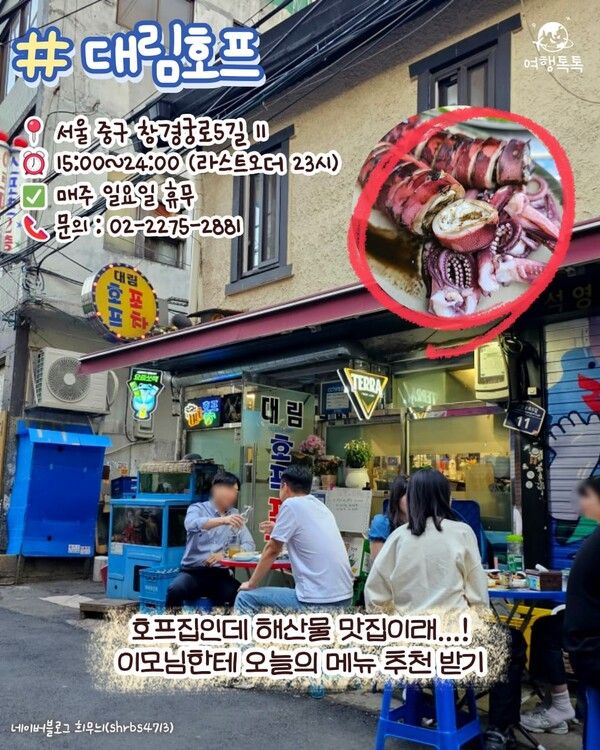 동네 호프집이면서도 특별한 각종 제철 해산물이 있는 대림호프는 요즘 힙지로라 불리는 이 동네에 잘 어울리는, 요즘 같은 날씨엔 야장이 가능해서 더욱 좋은 곳입니다.