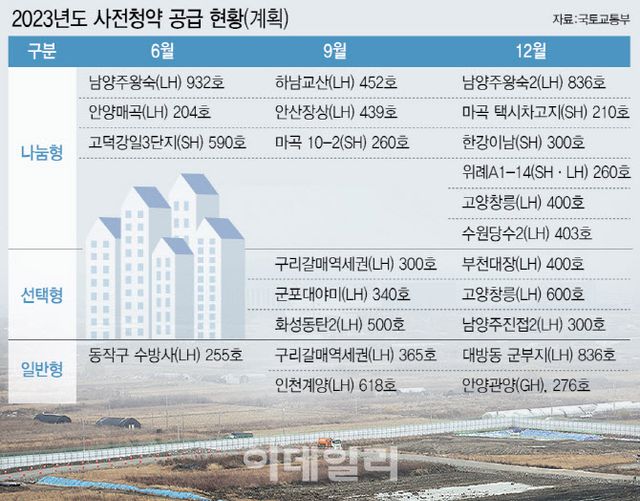 우선 나눔형은 서울 마곡 10-2(260가구), 하남 교산 A5(452가구), 안산 장상 A12(440가구) 등이다. 일반형은 남양주 진접2 A6(381가구), 구리갈매 역세권 A4(230가구), 인천 계양 A6(614가구) 등이며 이번에 처음 선보이는 선택형 물량은 남양주 진접2 A6(287가구), 구리갈매 역세권 A4(285가구), 군포 대야미 A1(364가구) 등이다.