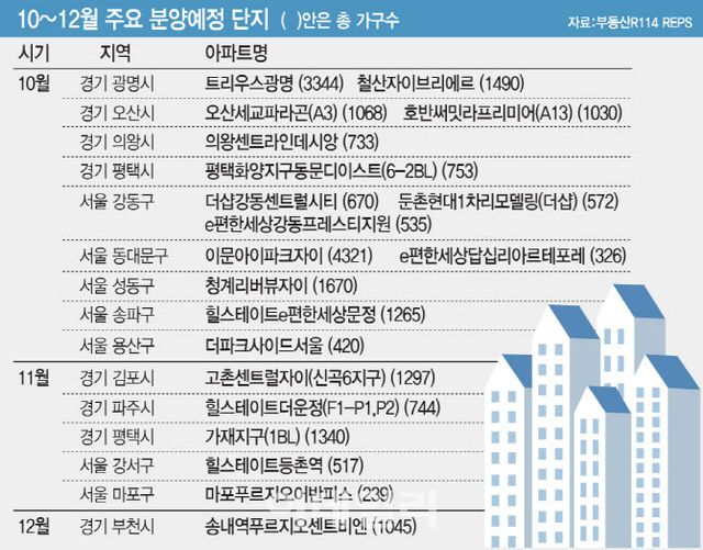 3일 부동산R114 자료에 따르면 추석 연휴가 끝나는 올 10월 전국에서 총 4만7829가구(임대 포함)가 분양에 나선다. 이는 지난해 10월 3만7046가구 대비 29% 이상 증가한 것이다. 시도별로 나눠보면 경기가 2만1405가구로 가장 많고 서울이 1만27가구로 뒤를 이었다. 이어 인천 4911가구, 강원 2804가구, 충남 2570가구 등 지방에서도 분양 계획이 예정돼 있다.