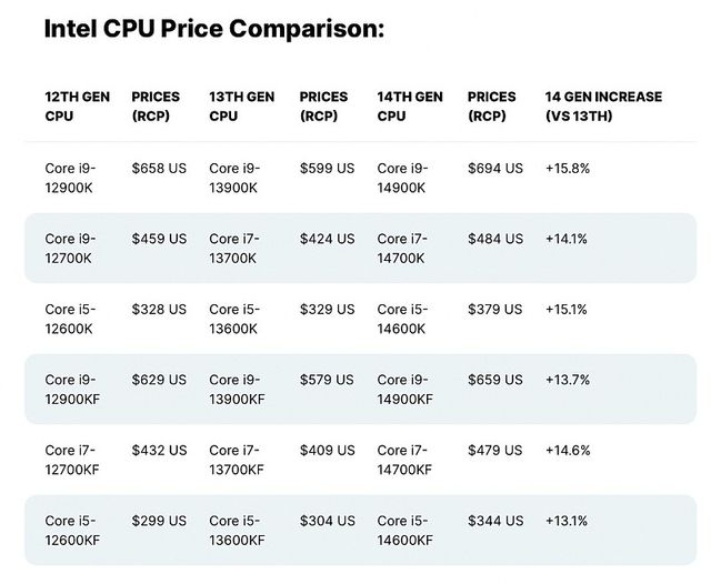 너무 좋은 소식만 알려줬나? 사실이 아니었으면 하는 소식도 있어. Momomo_US에 따르면 인텔의 14세대 데스크톱 CPU는 13세대 CPU에 비해 평균 15% 가격이 인상될 것으로 보여. 소매업체에 전달된 가격표를 보면 인텔 코어 i9-14900K와 코어 i9-14900KF는 각각 695달러와 660달러로 책정됐어.