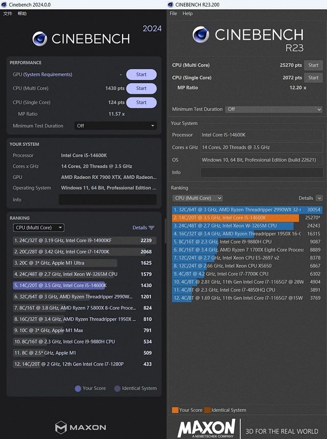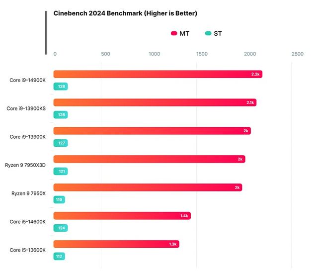 RX 7900 XTX 카드가 장착된 Z790 마더보드에서 i5-14600K CPU 테스트 결과를 볼까. 최신 시네벤치 2024에서 이전 세대인 i5-13600K 대비 싱글 및 멀티 스레드 모두에서 10% 더 빨랐어. 다만 MSI 피셜에 따르면 평균적으로 볼 때 14세대가 13세대보다 3% 빠르다고 해. 코어가 늘어난 모델의 성능만 좋아진 것이지.