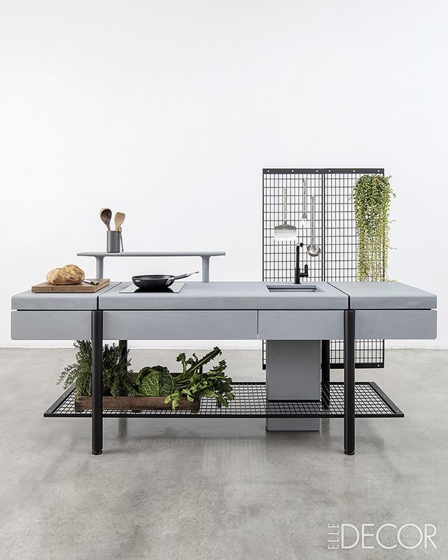 건축물을 설계하듯 주방을 디자인한 마르코 메렌디(Marco Merendi)와 디에고 벤카토(Diego Vencato). 이탈리아 디자이너 듀오 ‘메렌디 벤카토’는 미드센추리 건축에서 영감받아 ‘리베라(Libera)’를 설계했다. 강철 격자와 선반, LED 조명이 정교하게 구성돼 있는 주방은 벨벳 촉감의 컬러 콘크리트로 상판 전체를 마감해 부드럽고 편안한 사용감을 강조한다.