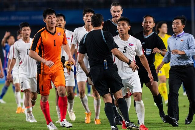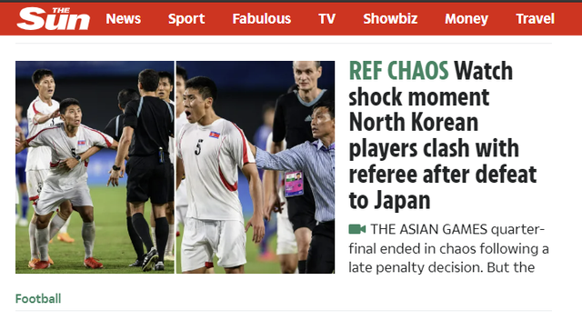 (엑스포츠뉴스 이태승 기자) 북한 남자축구대표팀 선수들이 2022 항저우 아시안게임 일본과의 8강전에서 패한 뒤 심판에게 우루루 달려가 위협적인 행동을 펼친 것에 대해 축구종가 영국 언론도 혀를 끌끌 차고 있다.