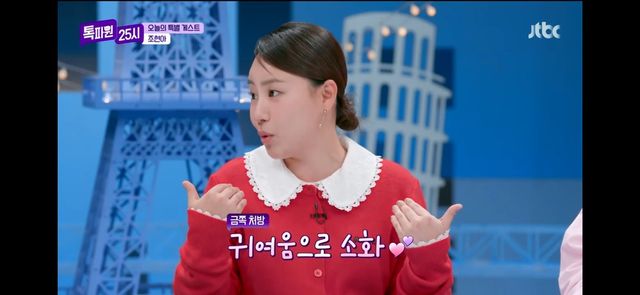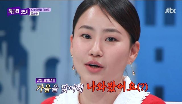 이어 김숙은 게스트도 소개했다. “늦가을이 어울리는 게스트다. 갬성 목소리, 어반자파카의 조현아 씨다”며 조현아를 소개했고 조현아는 “가을이다 보니까 한 번 톡파원 25시에 나와봤다”며 신박한 인사말을 남겨 웃음을 자아냈다.