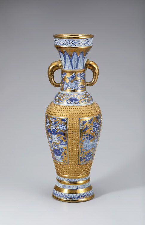 [이데일리 이윤정 기자] 도금이 칠해져 화려함을 뽐내는 ‘금련천막부 청화유금서수문상이반구병’. 반구의 긴 목 양쪽에 코끼리 코 양식이 달렸다. 목에는 봉황이, 몸체에는 기린과 연못 풍경이 청화로 그려져 있다. 바닥에는 ‘금련천막부’(金蓮川幕府, 원나라 최고 관청)라는 관지가 쓰여 있는데 이를 통해 궁중 유물임을 추측할 수 있다. 해당 유물은 다보성갤러리가 진행하는 온라인 경매에서 만나볼 수 있다.