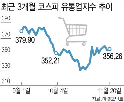 20일 마켓포인트에 따르면 코스피 유통업 지수는 지난 1일부터 이날까지 7.74% 올랐다. 같은 기간 9.36% 뛴 코스피 지수보다 낮은 상승률이다.