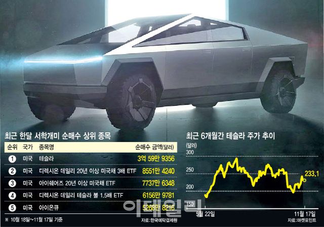 20일 한국예탁결제원 증권포털서비스 세이브로에 따르면 최근 한 달(10월 18일~11월 17일)간 서학개미의 테슬라 순매수 금액은 3억59만9356달러(3882억원)로 집계됐다. 이 기간 서학개미 순매수 상위 1위로, 2위인 상장지수펀드(ETF)인 ‘디렉시온 데일리 20년 이상 미국채 3배’(DIREXION DAILY 20+ YEAR TREASURY BULL 3X SHS)의 순매수액인 8551만달러(1104억원)의 4배에 이르는 수준이다.